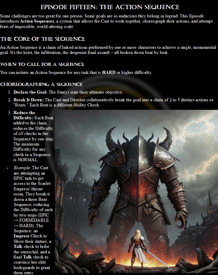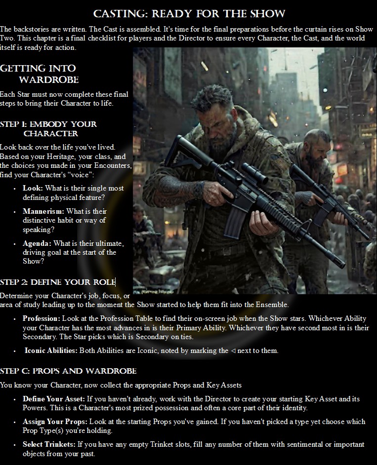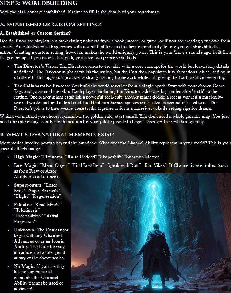 A Note on Craft: The core mechanics of Showrunner are the product of five years of passionate design and rigorous play-testing. After the system was complete, I used AI as a production tool to assist with layout, editing, and graphic design to give this project the professional presentation it deserves. The engine is human-built; the chassis was polished with a little help.