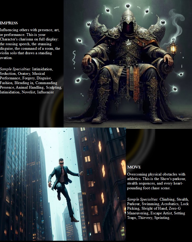 - Take Control of the Narrative: Spend Influence to modify your rolls, demand a 'retake' on a failure, or seize the 'spotlight' to guarantee your character shines.